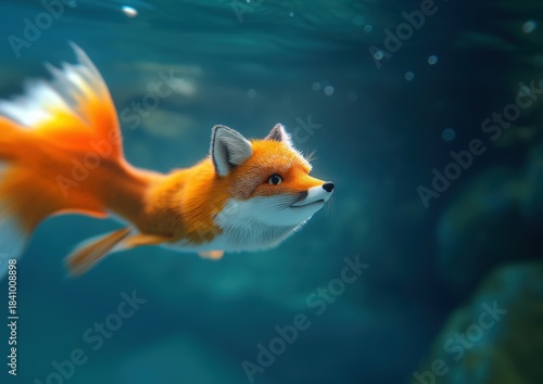 © Miramiska, Obraz premium A fox gracefully swims underwater, with its head breaking the surface of the water. Captures the animal's agility and natural behavior in an aquatic environment.