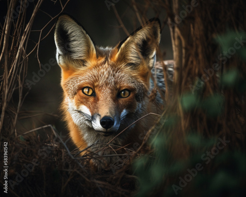 Fototapeta premium A fox hiding among the trees, AI generated