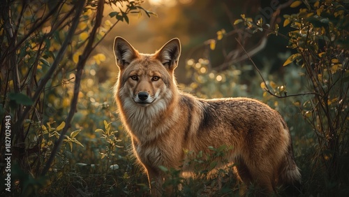 © Lasvu, Obraz premium A fox in a forest during sunset with warm lighting and lush foliage. Wildlife and nature scene. Forest habitat and mammal in natural environment.