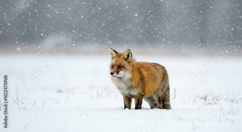 © Antonius, Fototapeta premium "A fox in a snowy meadow during light snowfall, with its fur fluffed up against the cold and snowflakes landing on its back."