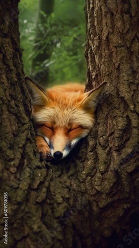 © orewinning, Fototapeta premium a fox in the forest catching its nap inside of a tree Generative Ai