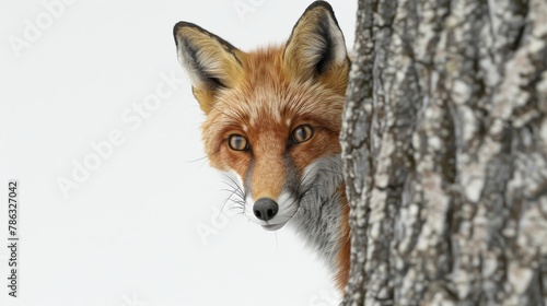 Fototapeta premium A fox is peeking out from behind a tree trunk