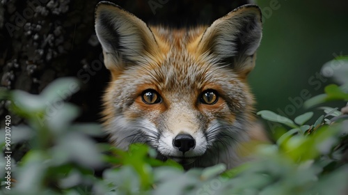 © Linus, Fototapeta premium A fox is peeking out from behind some leaves