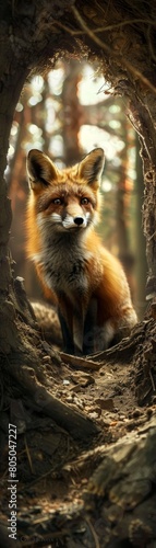 © Natthakan, Fototapeta premium A fox is sitting in a hole in the woods