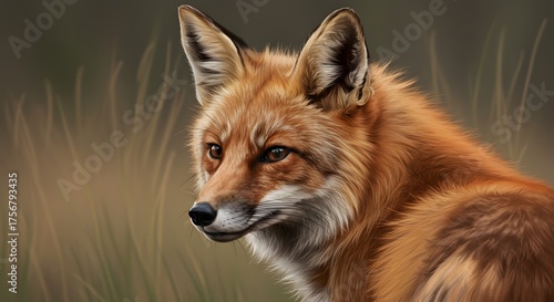 © Putri, Fototapeta premium A fox is visible facing left in a grassy area The artwork shows fine detail