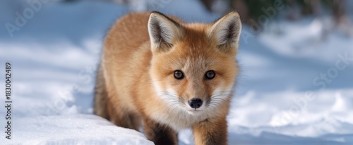 © ckybe, Naklejka premium A fox kit happily checking out the snowy landscape and frosty terrain.