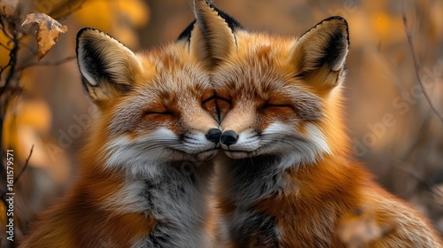 © Bussakon, Naklejka premium A fox nuzzling tenderly under the autumn leaves