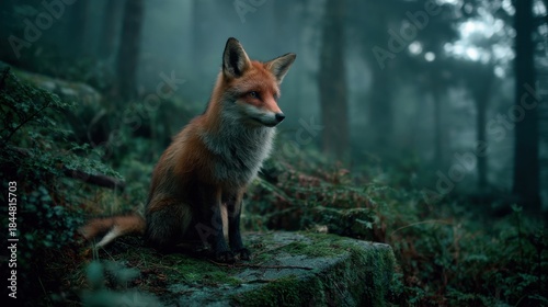 Naklejka premium A fox rests on a moss covered stone in a forest. It is early morning and fog surrounds the area. Trees are tall and create a dark setting. The fox looks calm and alert.