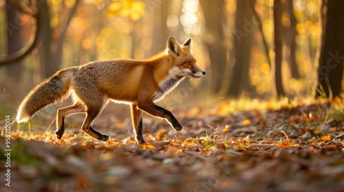 Fototapeta premium a fox running through a sunlit forest, with the golden hour light casting a...