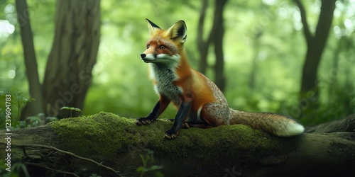 Fototapeta premium A fox sits on a moss-covered rock in a vibrant, lush forest.