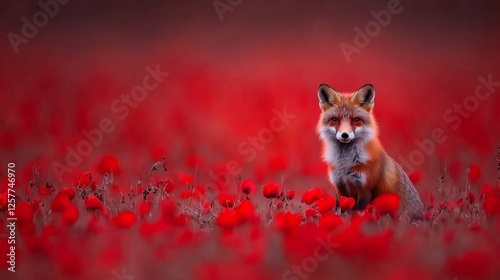 © Viktor, Naklejka premium A fox sitting in a field of red flowers