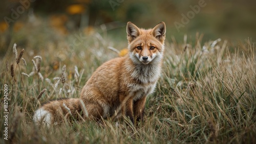 Naklejka premium A fox sitting in tall grass in a natural outdoor setting, surrounded by...