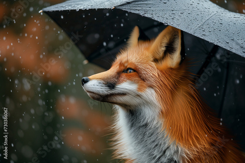 Fototapeta premium A fox sitting outside under a black umbrella, it's raining. Umbrella day.