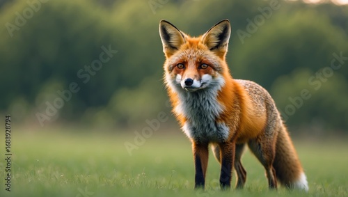 Fototapeta premium A fox standing on grass in a natural setting with blurred greenery in the...