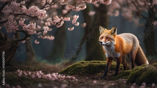 © AnisaHasby, Fototapeta premium A fox stands amidst blooming cherry blossoms in a serene forest setting.
