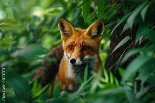 © Surachetsh, Naklejka premium A fox stands still in the forest, alert and serene. Surrounded by dense foliage, its amber eyes reflect curiosity and instinct. Nature elegance meets wild awareness.