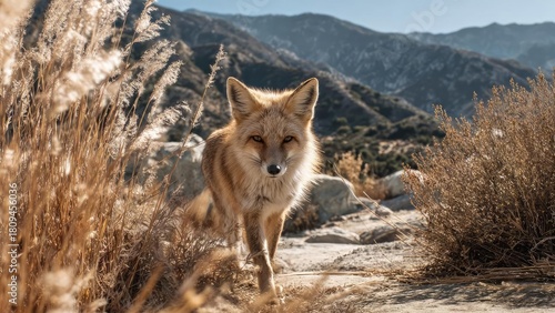 © Anastasiia, Obraz premium A fox walking through dry grass in an arid landscape with mountains in the distance. Concept Fox walking through dry grass in an arid landscape, Distant mountains over a parched desert terrain