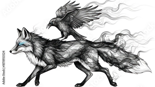 © Wattana, Fototapeta premium A fox with a raven on its back, flying through a dark, smoky sky.