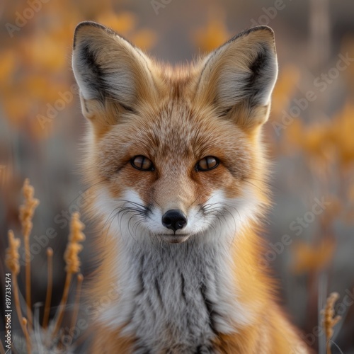 © JONATAS, Fototapeta premium A fox with perked-up ears stares intently at the camera, capturing a moment of alert curiosity.