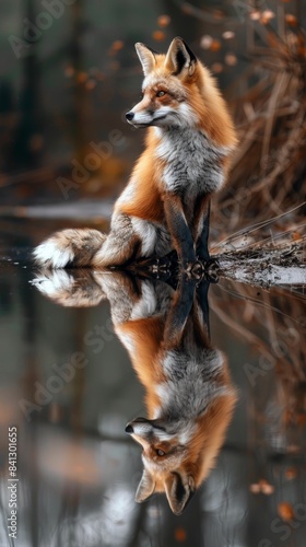 © Veronika, Obraz premium A fox with smooth fur sits by the river and looks at his reflection in the water.