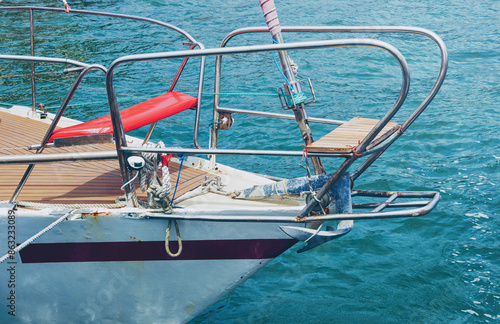 Naklejka premium A fragment of a yacht on the background of the sea, toned. Concept of the sea recreation.