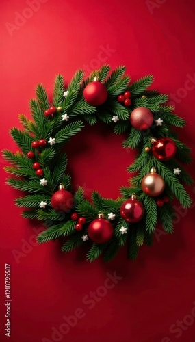 Fototapeta premium A fragrant pine branch wreath in red background adorned with colorful Christmas ornaments and berries, holiday, holly, evergreen