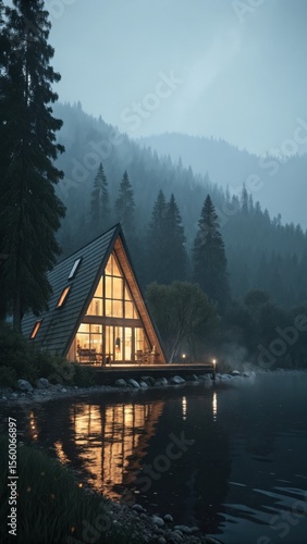 Fototapeta premium A frame cabin illuminated by warm light on a misty lake surrounded by forest trees at dusk