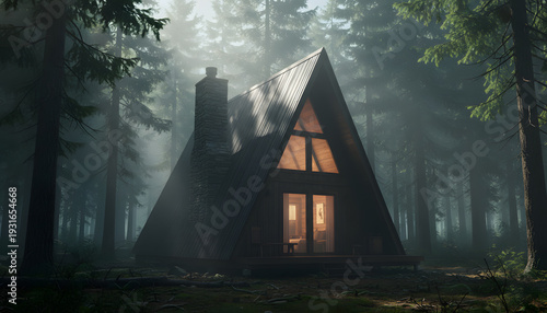Fototapeta premium A-frame cabin in misty pine forest