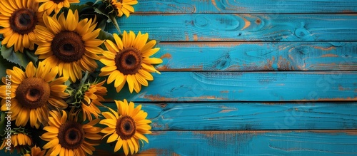 © Gular, Obraz premium A frame constructed with lovely sunflowers against a bright wooden backdrop provides a charming display with copy space image