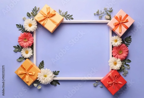 © Iqra, Obraz premium A frame made of colorful gift boxes and flowers on a white background