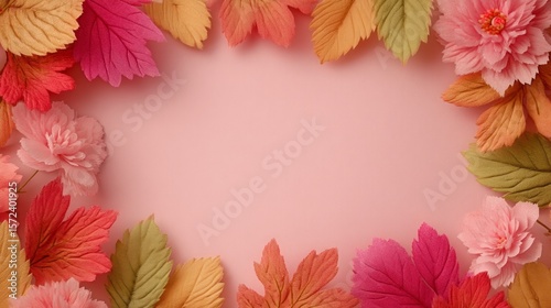 © Gulnaz, Obraz premium A frame of leaves and flowers with a pink background