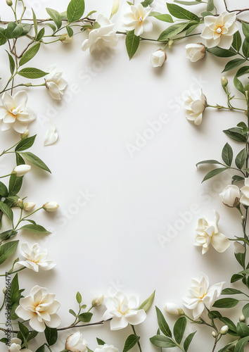 © Stone Story, Naklejka premium A frame of white gardenia flowers on a white background