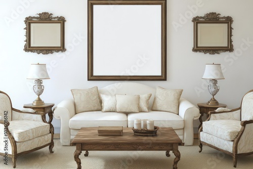 Fototapeta premium a framed blank vertical poster with aspect ratio 3:4 hanging on the wall in a Western living room