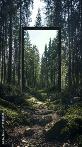 Obraz premium A framed woodland landscape showing a forest path among tall green trees