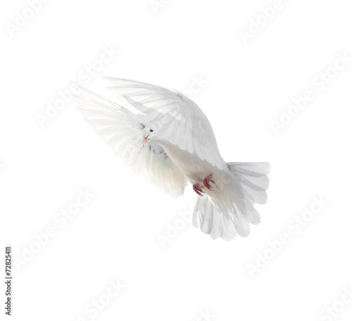 © schankz, Naklejka premium A free flying white dove isolated on a white background