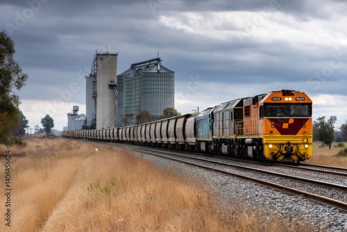 Obraz premium A freight train, loaded with grain containers, travels past a quarry site...