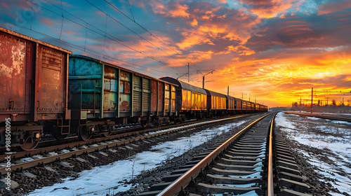 © Dmytro, Fototapeta premium A freight train on a railway track transports containers and tanks with fuel. AI Generated