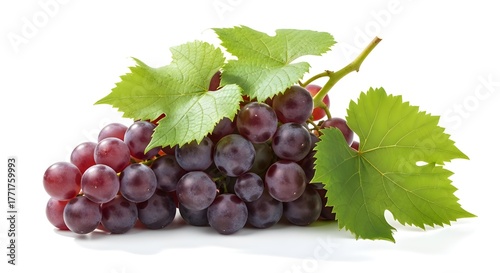 © Fauzan, Fototapeta premium A fresh bunch of ripe red grapes with vibrant green leaves, isolated on a clean white background, showcasing natural sweetness and health