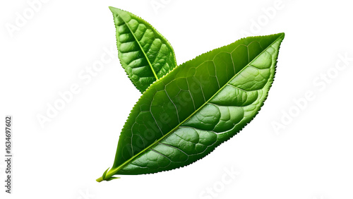 © Visualhub, Fototapeta premium a fresh green tea leaf on a white background for design purposes, flat lay