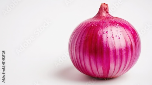 © PStyle, Fototapeta premium A fresh red onion with water droplets sits on a clean white background.