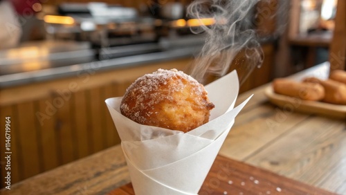 Fototapeta premium A freshly fried, sugar-dusted pastry, steaming in a white paper cone, sits on a wooden counter