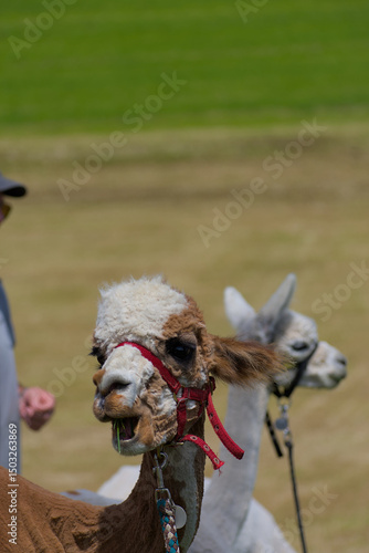 Obraz premium A freshly shorn alpaca stands gracefully, its soft fleece revealing crisp...