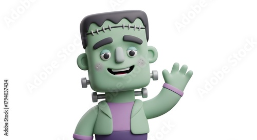 Obraz premium A friendly, cartoonish 3D illustration of Frankenstein's monster waving hello...