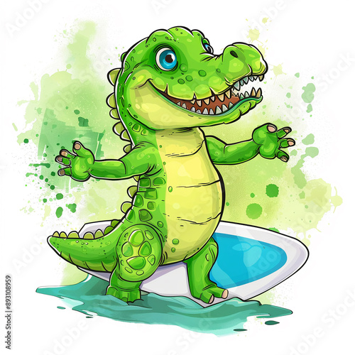 © Dreamphoto, Fototapeta premium A friendly crocodile with a surfboard designs for Print on Demand (POD) on a white background.