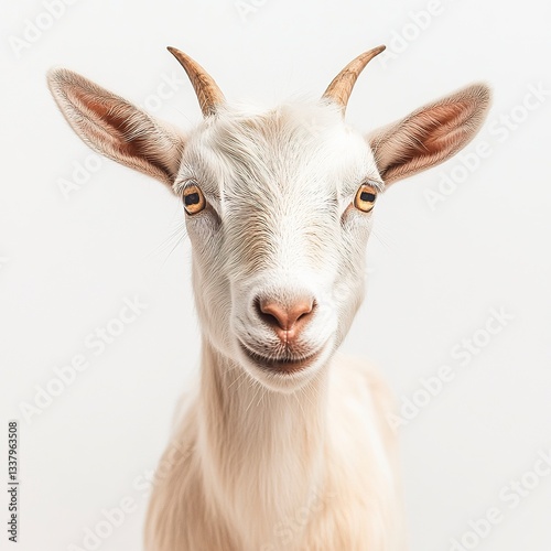 © Thanthara, Fototapeta premium A friendly dairy goat looking at the camera, soft fur texture detailed, natural pose, high-key lighting, crisp white background.