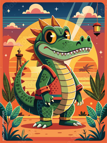 © Rizaldi, Fototapeta premium A Friendly Green Crocodile in a Red Vest Stands in a Tropical Sunset Landscape