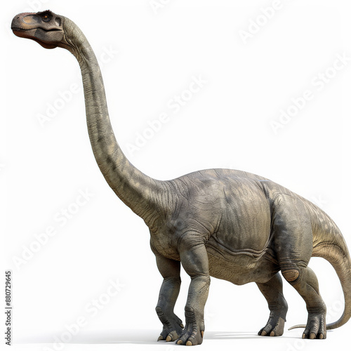 © AI_images, Obraz premium A friendly-looking Apatosaurus with its long neck and massive body, grazing peacefully, isolated on white background.