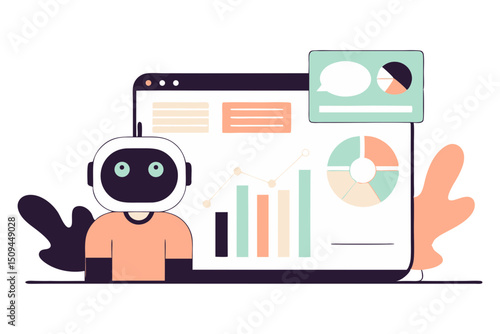 © ArtiePie, Obraz premium A friendly robot character standing in front of a large laptop screen displaying data, charts, and a chat bubble.
