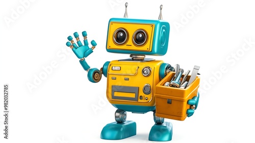 Fototapeta premium A friendly robot holding a toolbox, ready to help with any repairs.