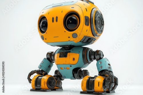 © Alienmarsh, Obraz premium A friendly, small, blue and orange robot with large eyes sits on a white background.
